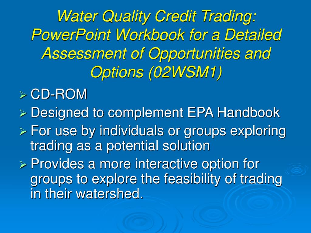 Water Quality Credit Trading: PowerPoint Workbook for a Detailed Assessment of Opportunities and Options (02WSM1) • CD-ROM • Designed to complement EPA Handbook • For use by individuals or groups exploring trading as a potential solution • Provides a more interactive option for groups to explore the feasibility of trading in their watershed.