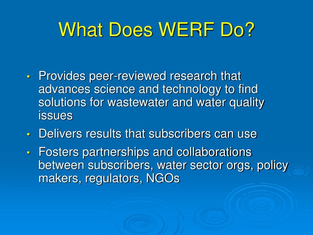 What Does WERF Do? • Provides peer-reviewed research that advances science and technology to find solutions for wastewater and water quality issues • Delivers results that subscribers can use • Fosters partnerships and collaborations between subscribers, water sector orgs, policy makers, regulators, NGOs