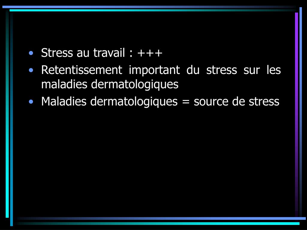 Stress au travail : +++ • Retentissement important du stress sur les maladies dermatologiques • Maladies dermatologiques = source de stress
