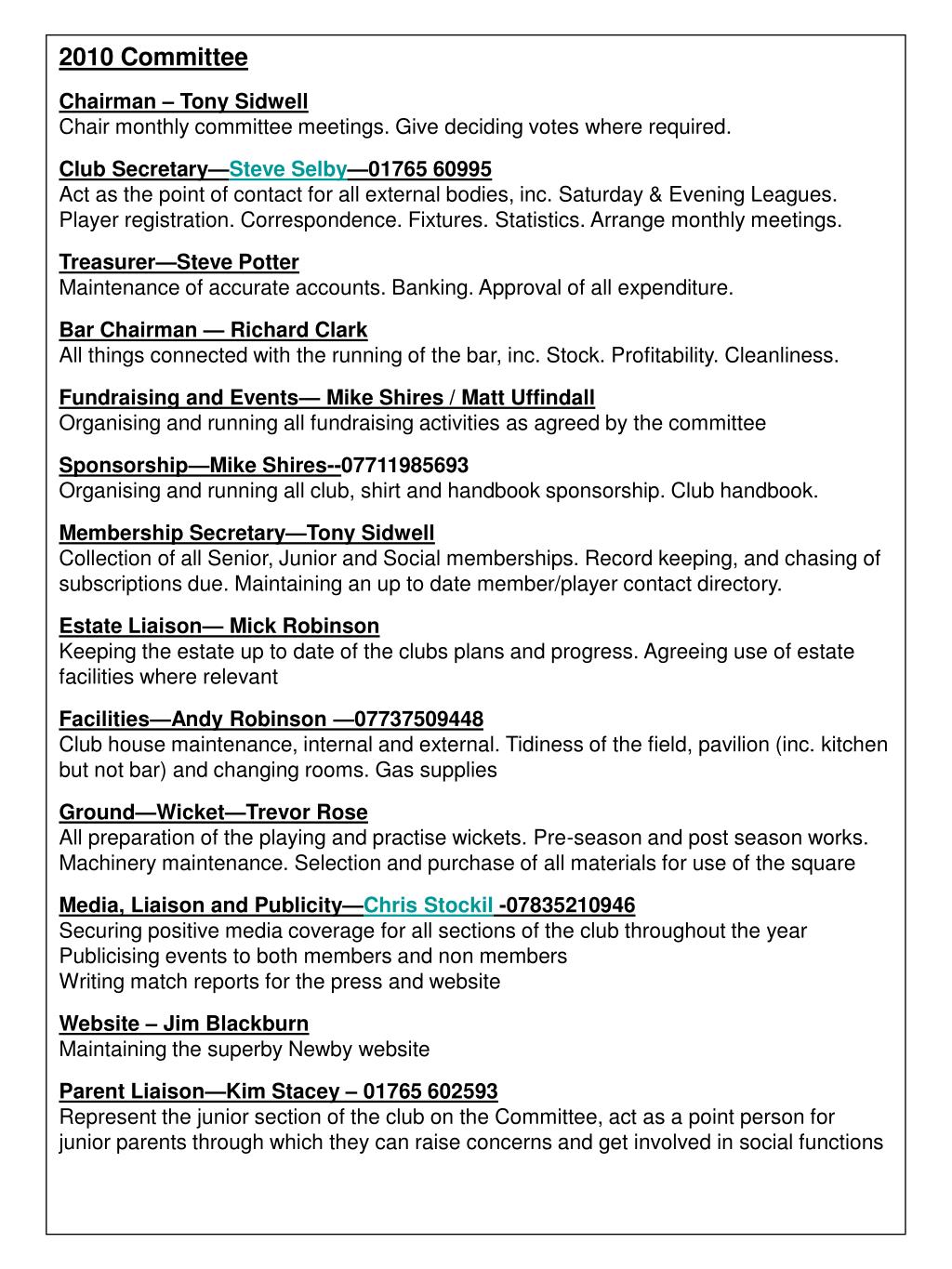 2010 Committee Chairman – Tony Sidwell Chair monthly committee meetings. Give deciding votes where required. Club Secretary—Steve Selby—01765 60995 Act as the point of contact for all external bodies, inc. Saturday & Evening Leagues. Player registration. Correspondence. Fixtures. Statistics. Arrange monthly meetings. Treasurer—Steve Potter Maintenance of accurate accounts. Banking. Approval of all expenditure. Bar Chairman — Richard Clark All things connected with the running of the bar, inc. Stock. Profitability. Cleanliness. Fundraising and Events— Mike Shires / Matt Uffindall Organising and running all fundraising activities as agreed by the committee Sponsorship—Mike Shires--07711985693 Organising and running all club, shirt and handbook sponsorship. Club handbook. Membership Secretary—Tony Sidwell Collection of all Senior, Junior and Social memberships. Record keeping, and chasing of subscriptions due. Maintaining an up to date member/player contact directory. Estate Liaison— Mick Robinson Keeping the estate up to date of the clubs plans and progress. Agreeing use of estate facilities where relevant Facilities—Andy Robinson —07737509448 Club house maintenance, internal and external. Tidiness of the field, pavilion (inc. kitchen but not bar) and changing rooms. Gas supplies Ground—Wicket—Trevor Rose All preparation of the playing and practise wickets. Pre-season and post season works. Machinery maintenance. Selection and purchase of all materials for use of the square Media, Liaison and Publicity—Chris Stockil -07835210946 Securing positive media coverage for all sections of the club throughout the year Publicising events to both members and non members Writing match reports for the press and website Website – Jim Blackburn Maintaining the superby Newby website Parent Liaison—Kim Stacey – 01765 602593 Represent the junior section of the club on the Committee, act as a point person for junior parents through which they can raise concerns and get involved in social functions