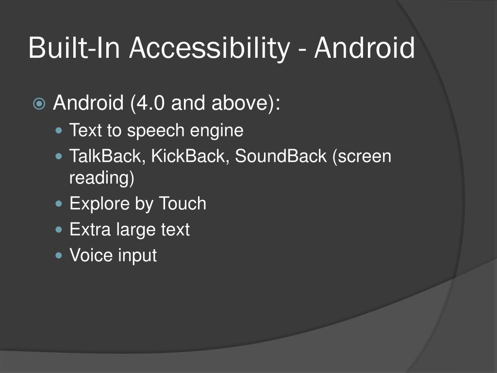 Built-In Accessibility - Android • Android (4.0 and above): • Text to speech engine • TalkBack, KickBack, SoundBack (screen reading) • Explore by Touch • Extra large text • Voice input