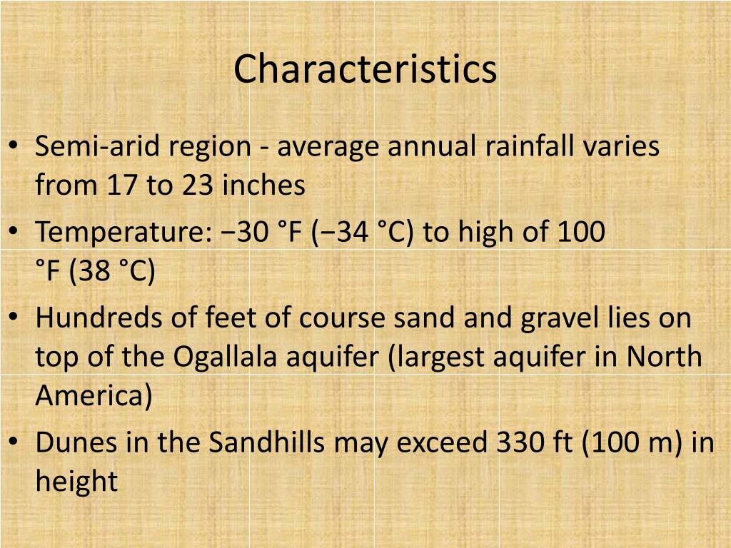 Characteristics • Semi-arid region - average annual rainfall varies from 17 to 23 inches • Temperature: −30 °F (−34 °C) to high of 100 °F (38 °C) • Hundreds of feet of course sand and gravel lies on top of the Ogallala aquifer (largest aquifer in North America) • Dunes in the Sandhills may exceed 330 ft (100 m) in height