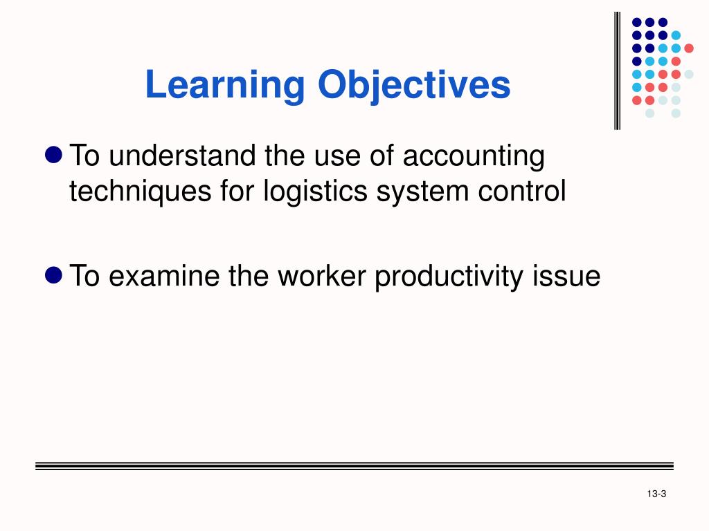 Learning Objectives • To understand the use of accounting techniques for logistics system control • To examine the worker productivity issue