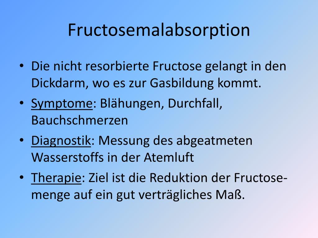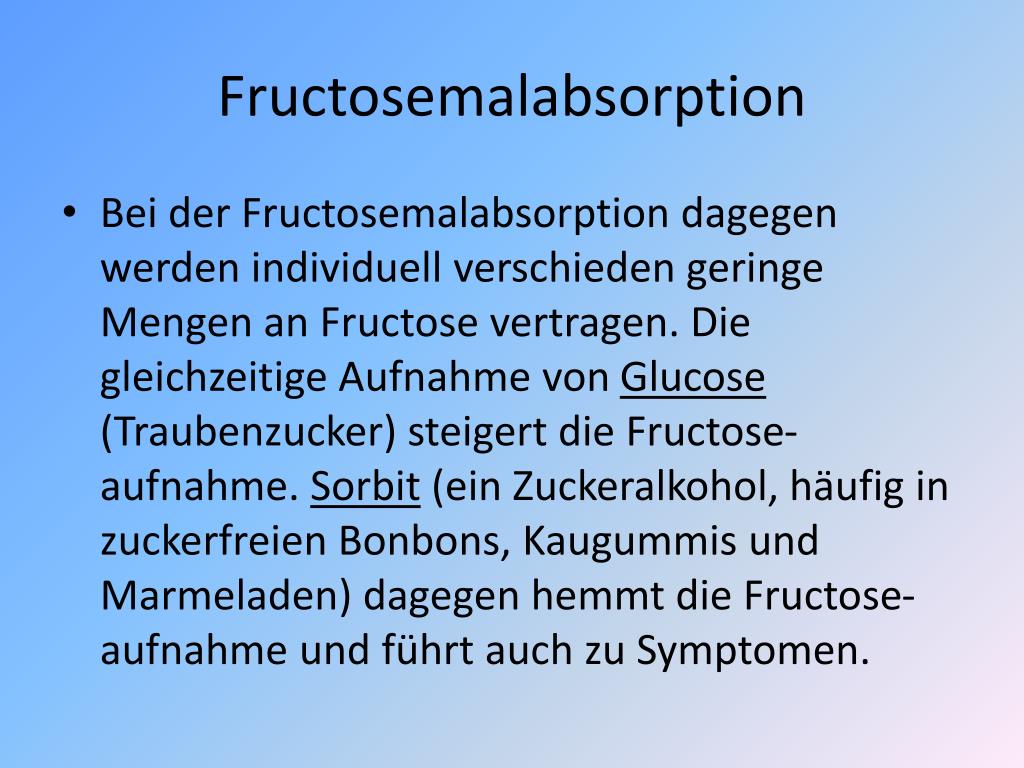 Fructosemalabsorption • Bei der Fructosemalabsorption dagegen werden individuell verschieden geringe Mengen an Fructose vertragen. Die gleichzeitige Aufnahme von Glucose (Traubenzucker) steigert die Fructose-aufnahme. Sorbit (ein Zuckeralkohol, häufig in zuckerfreien Bonbons, Kaugummis und Marmeladen) dagegen hemmt die Fructose-aufnahme und führt auch zu Symptomen.