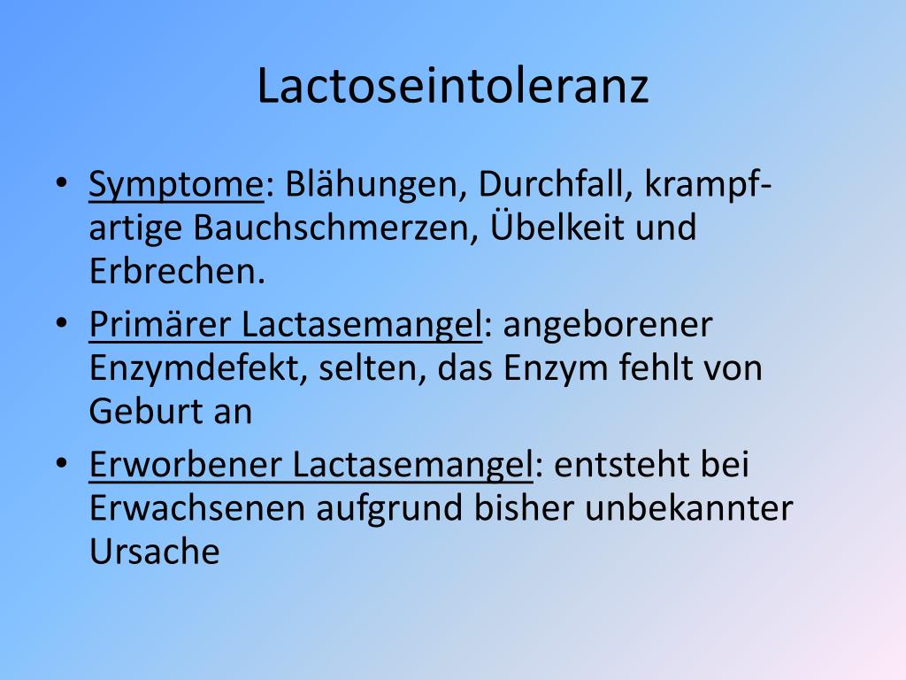 Lactoseintoleranz • Symptome: Blähungen, Durchfall, krampf-artige Bauchschmerzen, Übelkeit und Erbrechen. • Primärer Lactasemangel: angeborener Enzymdefekt, selten, das Enzym fehlt von Geburt an • Erworbener Lactasemangel: entsteht bei Erwachsenen aufgrund bisher unbekannter Ursache