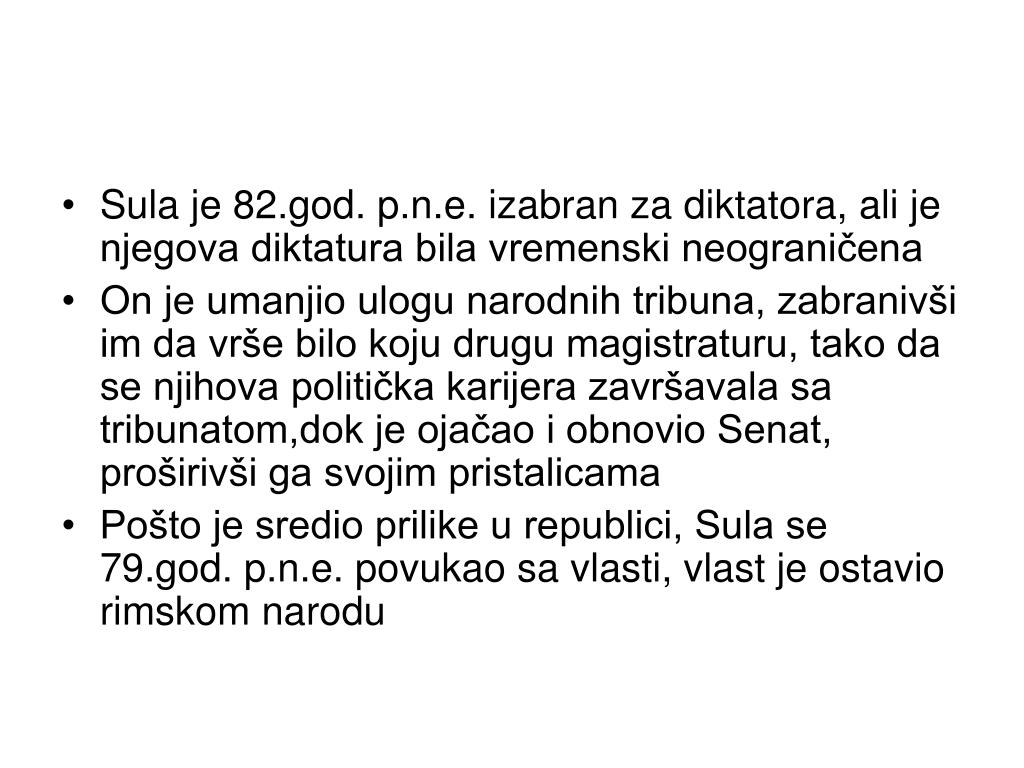 Sula je 82.god. p.n.e. izabran za diktatora, ali je njegova diktatura bila vremenski neograničena • On je umanjio ulogu narodnih tribuna, zabranivši im da vrše bilo koju drugu magistraturu, tako da se njihova politička karijera završavala sa tribunatom,dok je ojačao i obnovio Senat, proširivši ga svojim pristalicama • Pošto je sredio prilike u republici, Sula se 79.god. p.n.e. povukao sa vlasti, vlast je ostavio rimskom narodu