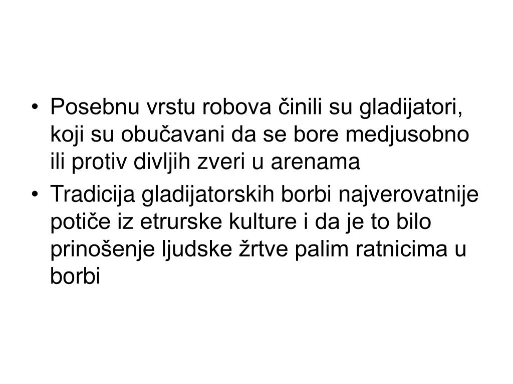 Posebnu vrstu robova činili su gladijatori, koji su obučavani da se bore medjusobno ili protiv divljih zveri u arenama • Tradicija gladijatorskih borbi najverovatnije potiče iz etrurske kulture i da je to bilo prinošenje ljudske žrtve palim ratnicima u borbi