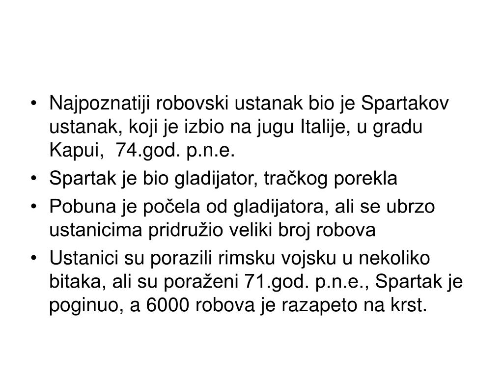 Najpoznatiji robovski ustanak bio je Spartakov ustanak, koji je izbio na jugu Italije, u gradu Kapui, 74.god. p.n.e. • Spartak je bio gladijator, tračkog porekla • Pobuna je počela od gladijatora, ali se ubrzo ustanicima pridružio veliki broj robova • Ustanici su porazili rimsku vojsku u nekoliko bitaka, ali su poraženi 71.god. p.n.e., Spartak je poginuo, a 6000 robova je razapeto na krst.