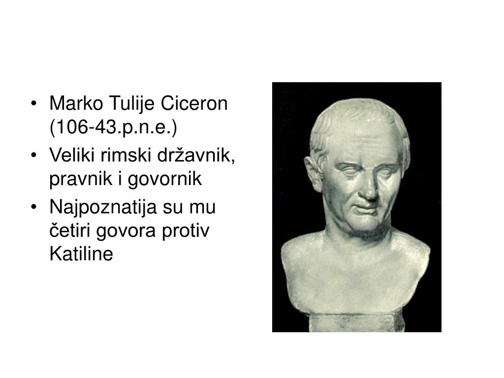 Marko Tulije Ciceron (106-43.p.n.e.) • Veliki rimski državnik, pravnik i govornik • Najpoznatija su mu četiri govora protiv Katiline