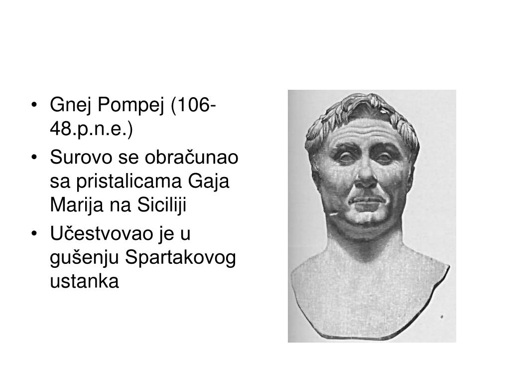 Gnej Pompej (106-48.p.n.e.) • Surovo se obračunao sa pristalicama Gaja Marija na Siciliji • Učestvovao je u gušenju Spartakovog ustanka