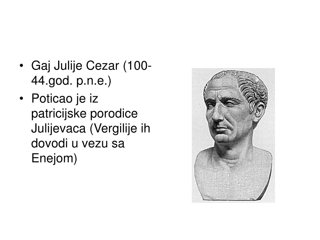 Gaj Julije Cezar (100-44.god. p.n.e.) • Poticao je iz patricijske porodice Julijevaca (Vergilije ih dovodi u vezu sa Enejom)
