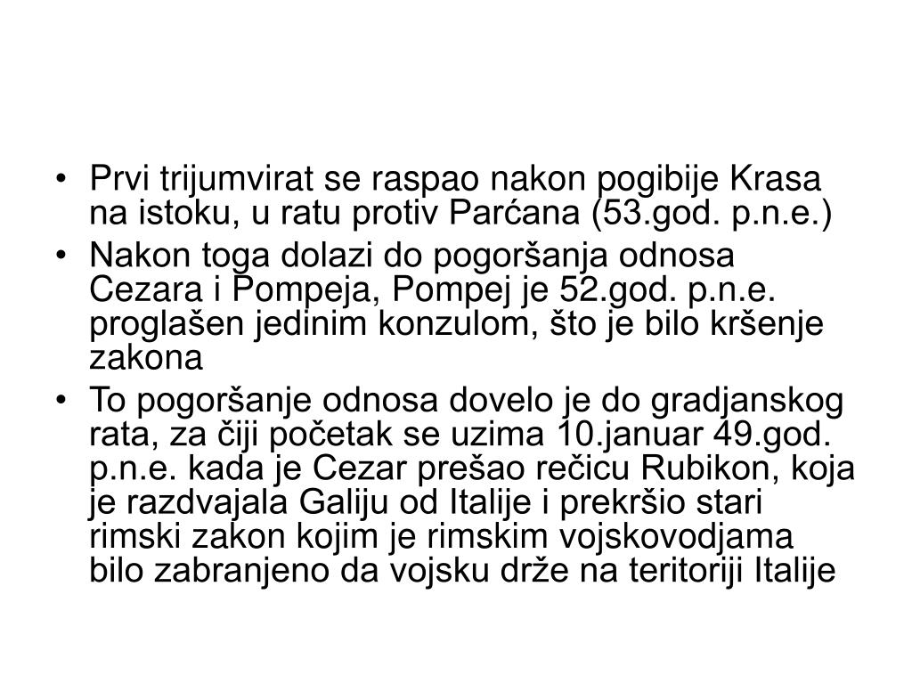 Prvi trijumvirat se raspao nakon pogibije Krasa na istoku, u ratu protiv Parćana (53.god. p.n.e.) • Nakon toga dolazi do pogoršanja odnosa Cezara i Pompeja, Pompej je 52.god. p.n.e. proglašen jedinim konzulom, što je bilo kršenje zakona • To pogoršanje odnosa dovelo je do gradjanskog rata, za čiji početak se uzima 10.januar 49.god. p.n.e. kada je Cezar prešao rečicu Rubikon, koja je razdvajala Galiju od Italije i prekršio stari rimski zakon kojim je rimskim vojskovodjama bilo zabranjeno da vojsku drže na teritoriji Italije