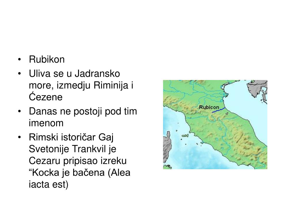Rubikon • Uliva se u Jadransko more, izmedju Riminija i Ćezene • Danas ne postoji pod tim imenom • Rimski istoričar Gaj Svetonije Trankvil je Cezaru pripisao izreku “Kocka je bačena (Alea iacta est)