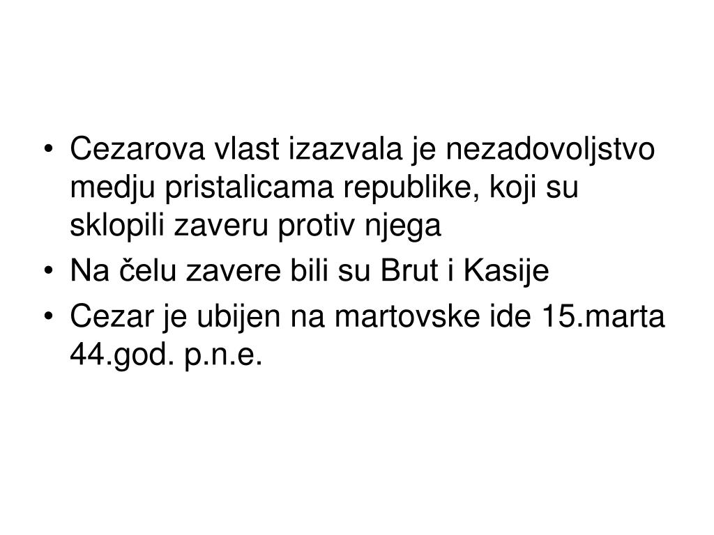 Cezarova vlast izazvala je nezadovoljstvo medju pristalicama republike, koji su sklopili zaveru protiv njega • Na čelu zavere bili su Brut i Kasije • Cezar je ubijen na martovske ide 15.marta 44.god. p.n.e.
