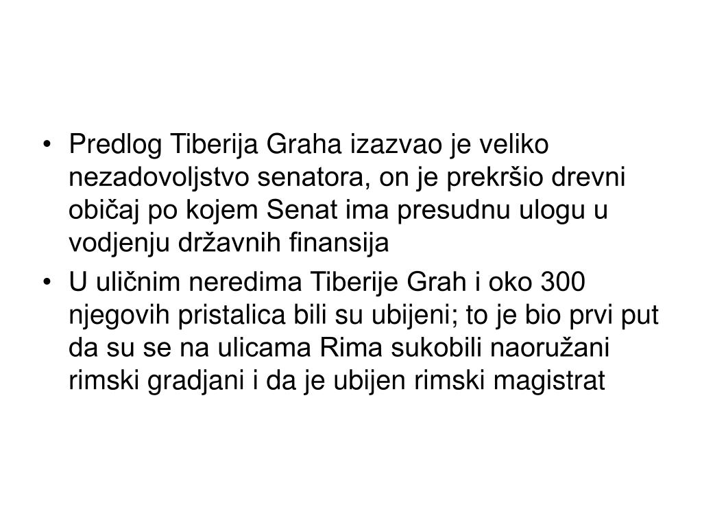 Proleteri nisu služili u rimskoj vojsci, jer nisu posedovali imovinu, zbog čega se propadanje seljaka negativno odrazilo na vojnu moć Rima • Agrarnu krizu je 133.god. p.n.e. pokušao da reši narodni tribun Tiberije Grah • Narodna skupština je, na njegov predlog, usvojila agrarni zakon po kojem nijedan rimski gradjanin nije mogao da poseduje više od 500 jutara državne zemlje (1 jutro 5754,64 m²), dok je višak trebalo podeliti siromašnim seljacima
