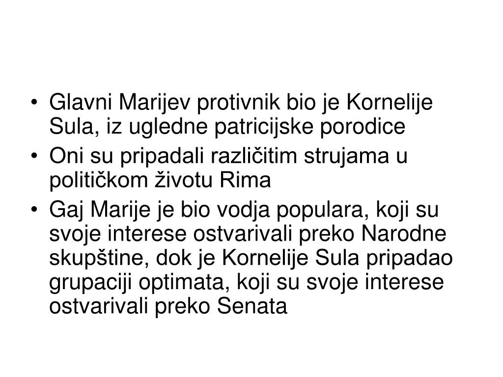 Glavni Marijev protivnik bio je Kornelije Sula, iz ugledne patricijske porodice • Oni su pripadali različitim strujama u političkom životu Rima • Gaj Marije je bio vodja populara, koji su svoje interese ostvarivali preko Narodne skupštine, dok je Kornelije Sula pripadao grupaciji optimata, koji su svoje interese ostvarivali preko Senata