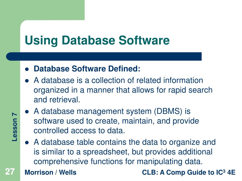Using Database Software • Database Software Defined: • A database is a collection of related information organized in a manner that allows for rapid search and retrieval. • A database management system (DBMS) is software used to create, maintain, and provide controlled access to data. • A database table contains the data to organize and is similar to a spreadsheet, but provides additional comprehensive functions for manipulating data. 27 27