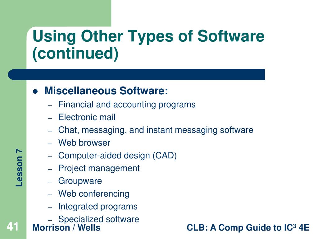 Using Other Types of Software (continued) • Miscellaneous Software: • Financial and accounting programs • Electronic mail • Chat, messaging, and instant messaging software • Web browser • Computer-aided design (CAD) • Project management • Groupware • Web conferencing • Integrated programs • Specialized software 41 41