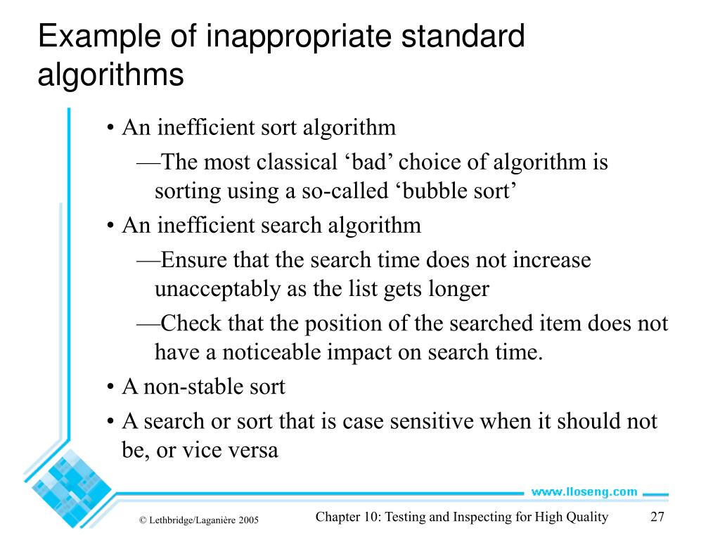 Example of inappropriate standard algorithms • An inefficient sort algorithm • The most classical ‘bad’ choice of algorithm is sorting using a so-called ‘bubble sort’ • An inefficient search algorithm • Ensure that the search time does not increase unacceptably as the list gets longer • Check that the position of the searched item does not have a noticeable impact on search time. • A non-stable sort • A search or sort that is case sensitive when it should not be, or vice versa Chapter 10: Testing and Inspecting for High Quality