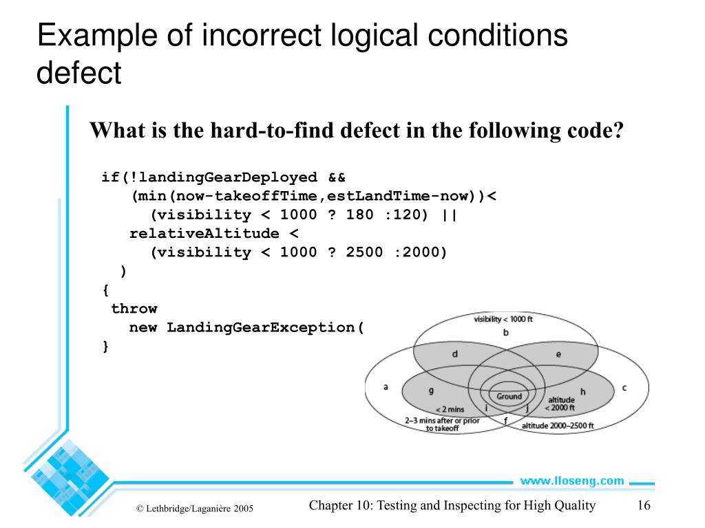 Example of incorrect logical conditions defect What is the hard-to-find defect in the following code? if(!landingGearDeployed && (min(now-takeoffTime,estLandTime-now))< (visibility < 1000 ? 180 :120) || relativeAltitude < (visibility < 1000 ? 2500 :2000) ) { throw new LandingGearException(); } Chapter 10: Testing and Inspecting for High Quality
