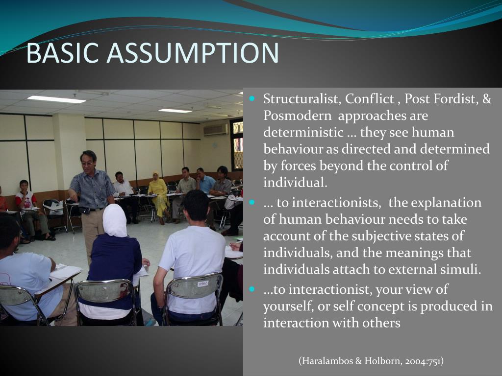 BASIC ASSUMPTION • Structuralist, Conflict , Post Fordist, & Posmodern approaches are deterministic … they see human behaviour as directed and determined by forces beyond the control of individual. • … to interactionists, the explanation of human behaviour needs to take account of the subjective states of individuals, and the meanings that individuals attach to external simuli. • …to interactionist, your view of yourself, or self concept is produced in interaction with others (Haralambos & Holborn, 2004:751)