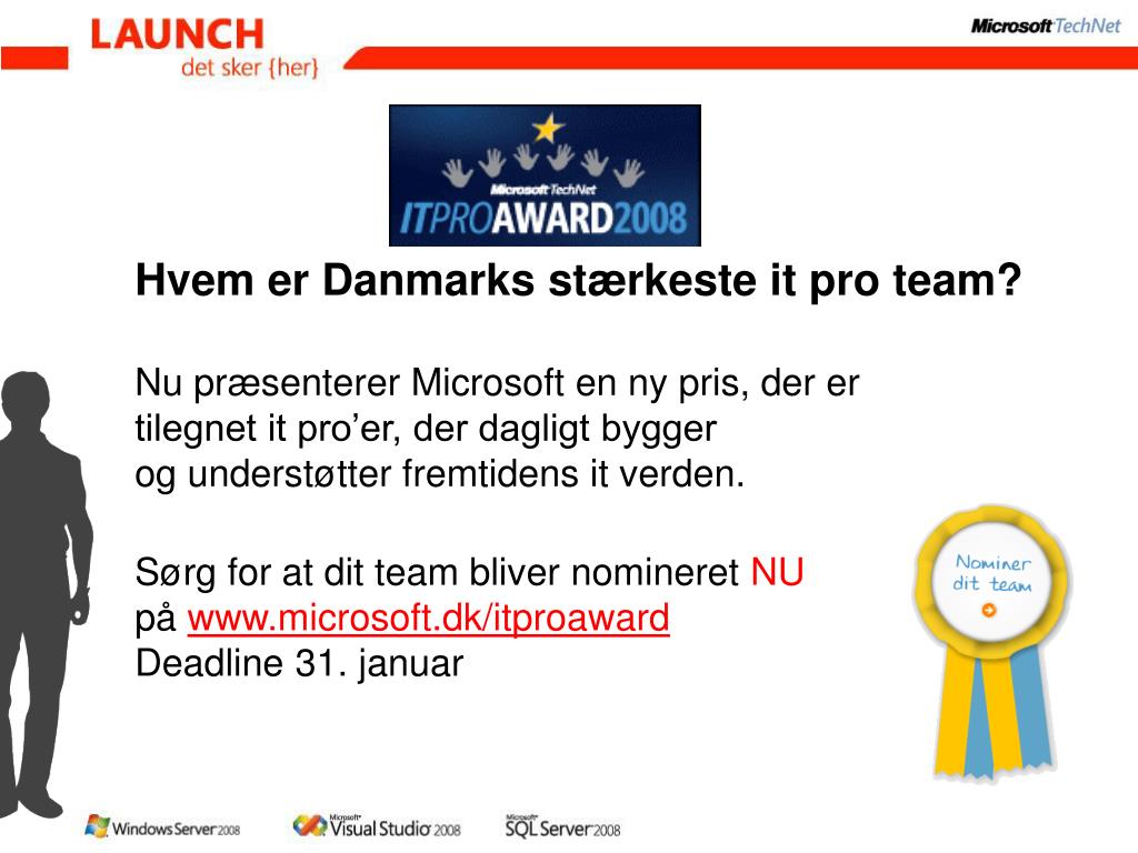 Hvem er Danmarks stærkeste it pro team? Nu præsenterer Microsoft en ny pris, der er tilegnet it pro’er, der dagligt bygger og understøtter fremtidens it verden. Sørg for at dit team bliver nomineret NU på www.microsoft.dk/itproaward Deadline 31. januar