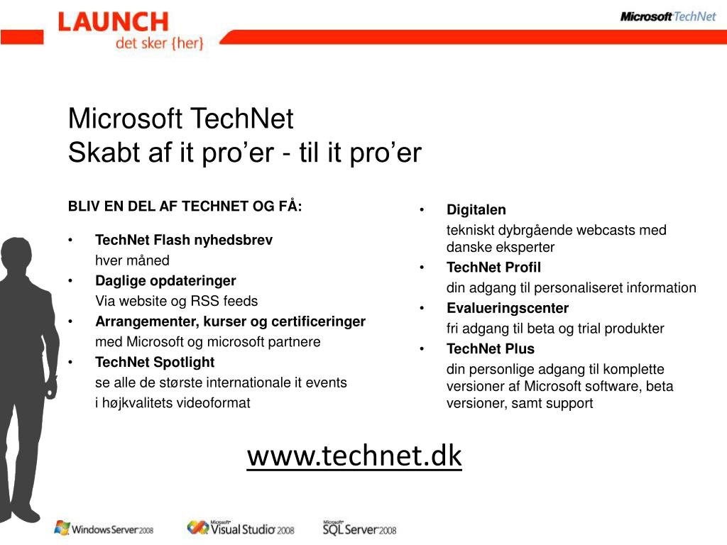Microsoft TechNet Skabt af it pro’er - til it pro’er BLIV EN DEL AF TECHNET OG FÅ: • TechNet Flash nyhedsbrev hver måned • Daglige opdateringer Via website og RSS feeds • Arrangementer, kurser og certificeringer med Microsoft og microsoft partnere • TechNet Spotlight se alle de største internationale it events i højkvalitets videoformat • Digitalen tekniskt dybrgående webcasts med danske eksperter • TechNet Profil din adgang til personaliseret information • Evalueringscenter fri adgang til beta og trial produkter • TechNet Plus din personlige adgang til komplette versioner af Microsoft software, beta versioner, samt support • www.technet.dk