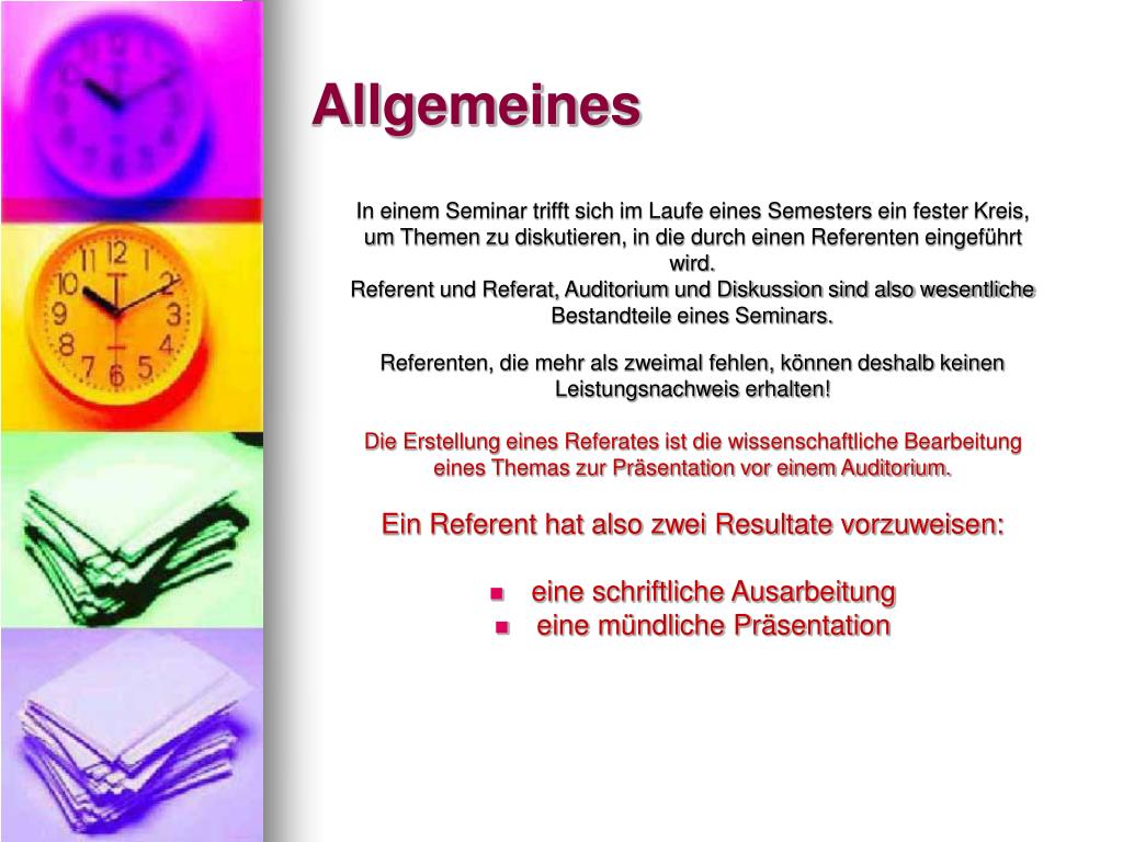 Allgemeines In einem Seminar trifft sich im Laufe eines Semesters ein fester Kreis, um Themen zu diskutieren, in die durch einen Referenten eingeführt wird. Referent und Referat, Auditorium und Diskussion sind also wesentliche Bestandteile eines Seminars. Referenten, die mehr als zweimal fehlen, können deshalb keinen Leistungsnachweis erhalten! Die Erstellung eines Referates ist die wissenschaftliche Bearbeitung eines Themas zur Präsentation vor einem Auditorium. Ein Referent hat also zwei Resultate vorzuweisen: • eine schriftliche Ausarbeitung • eine mündliche Präsentation