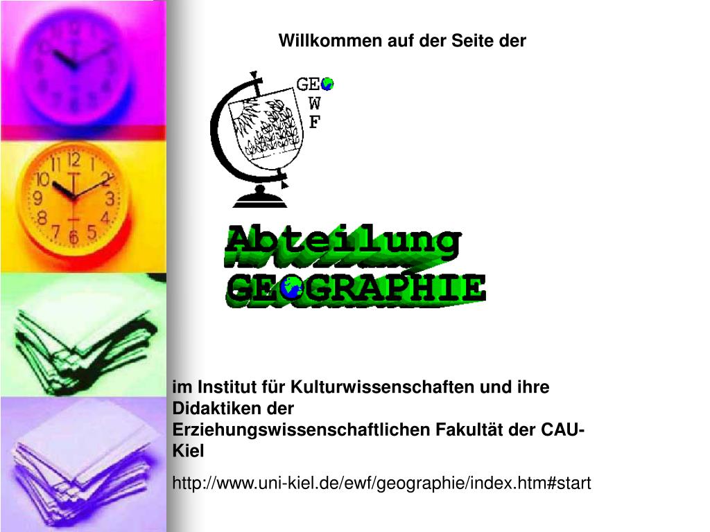 Willkommen auf der Seite der im Institut für Kulturwissenschaften und ihre Didaktiken derErziehungswissenschaftlichen Fakultät der CAU-Kiel http://www.uni-kiel.de/ewf/geographie/index.htm#start