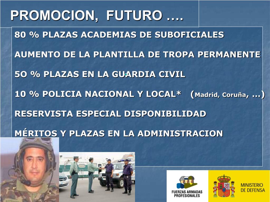 PROMOCION, FUTURO …. 80 % PLAZAS ACADEMIAS DE SUBOFICIALES AUMENTO DE LA PLANTILLA DE TROPA PERMANENTE 5O % PLAZAS EN LA GUARDIA CIVIL 10 % POLICIA NACIONAL Y LOCAL* (Madrid, Coruña, …) RESERVISTA ESPECIAL DISPONIBILIDAD MÉRITOS Y PLAZAS EN LA ADMINISTRACION