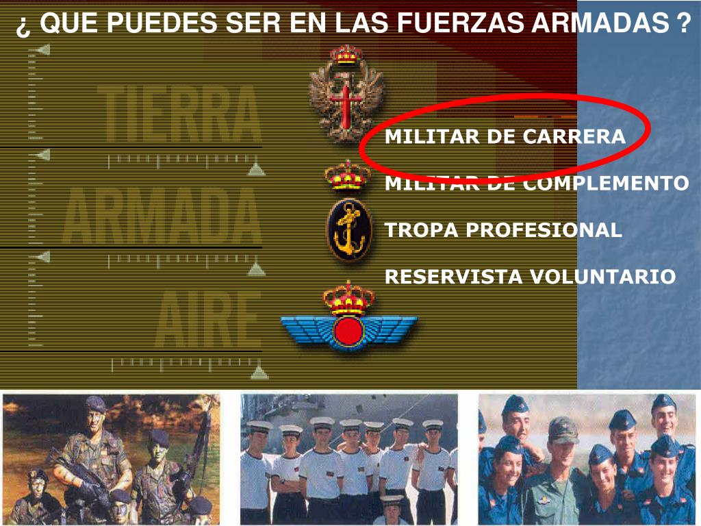 ¿ QUE PUEDES SER EN LAS FUERZASARMADAS? MILITAR DE CARRERA MILITAR DE COMPLEMENTO TROPA PROFESIONAL RESERVISTA VOLUNTARIO