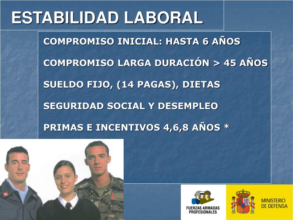 ESTABILIDAD LABORAL COMPROMISO INICIAL: HASTA 6 AÑOS COMPROMISO LARGA DURACIÓN > 45 AÑOS SUELDO FIJO, (14 PAGAS), DIETAS SEGURIDAD SOCIAL Y DESEMPLEO PRIMAS E INCENTIVOS 4,6,8 AÑOS *