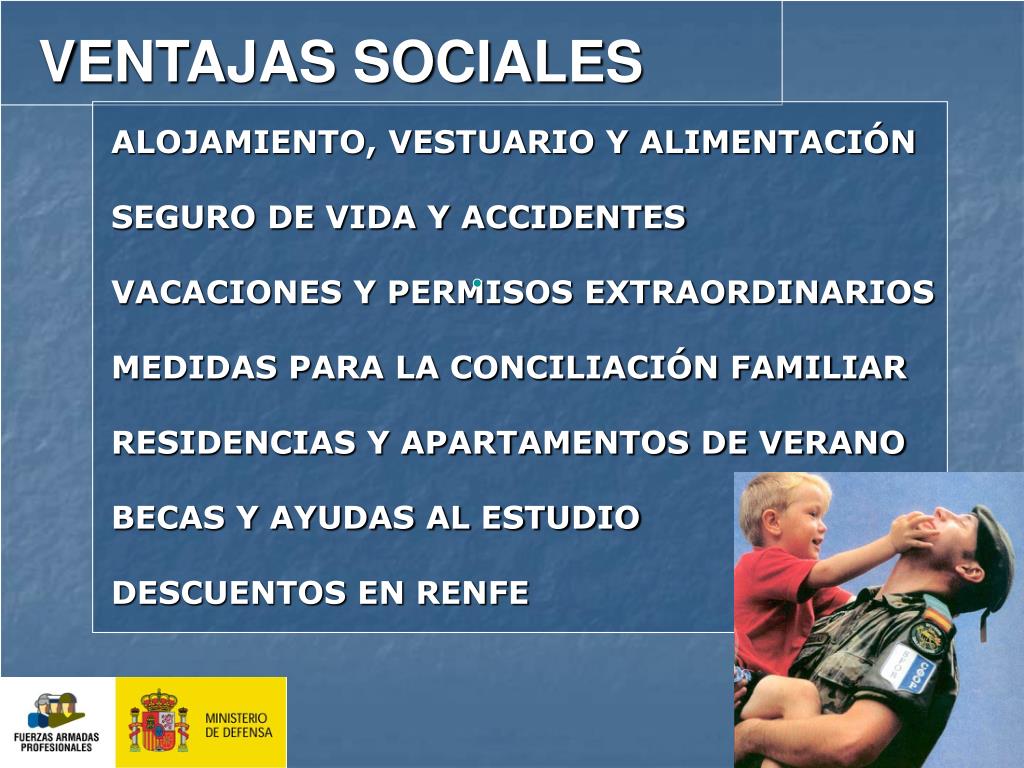 VENTAJAS SOCIALES ALOJAMIENTO, VESTUARIO Y ALIMENTACIÓN SEGURO DE VIDA Y ACCIDENTES VACACIONES Y PERMISOS EXTRAORDINARIOS MEDIDAS PARA LA CONCILIACIÓN FAMILIAR RESIDENCIAS Y APARTAMENTOS DE VERANO BECAS Y AYUDAS AL ESTUDIO DESCUENTOS EN RENFE