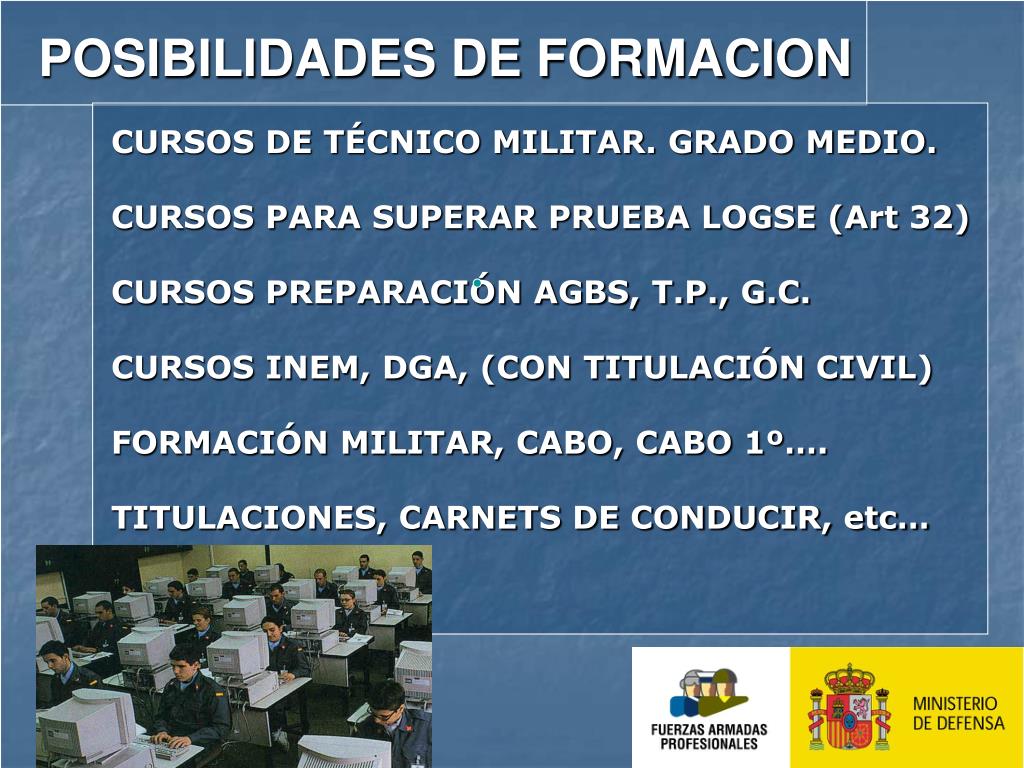 POSIBILIDADES DE FORMACION CURSOS DE TÉCNICO MILITAR. GRADO MEDIO. CURSOS PARA SUPERAR PRUEBA LOGSE (Art 32) CURSOS PREPARACIÓN AGBS, T.P., G.C. CURSOS INEM, DGA, (CON TITULACIÓN CIVIL) FORMACIÓN MILITAR, CABO, CABO 1º…. TITULACIONES, CARNETS DE CONDUCIR, etc…