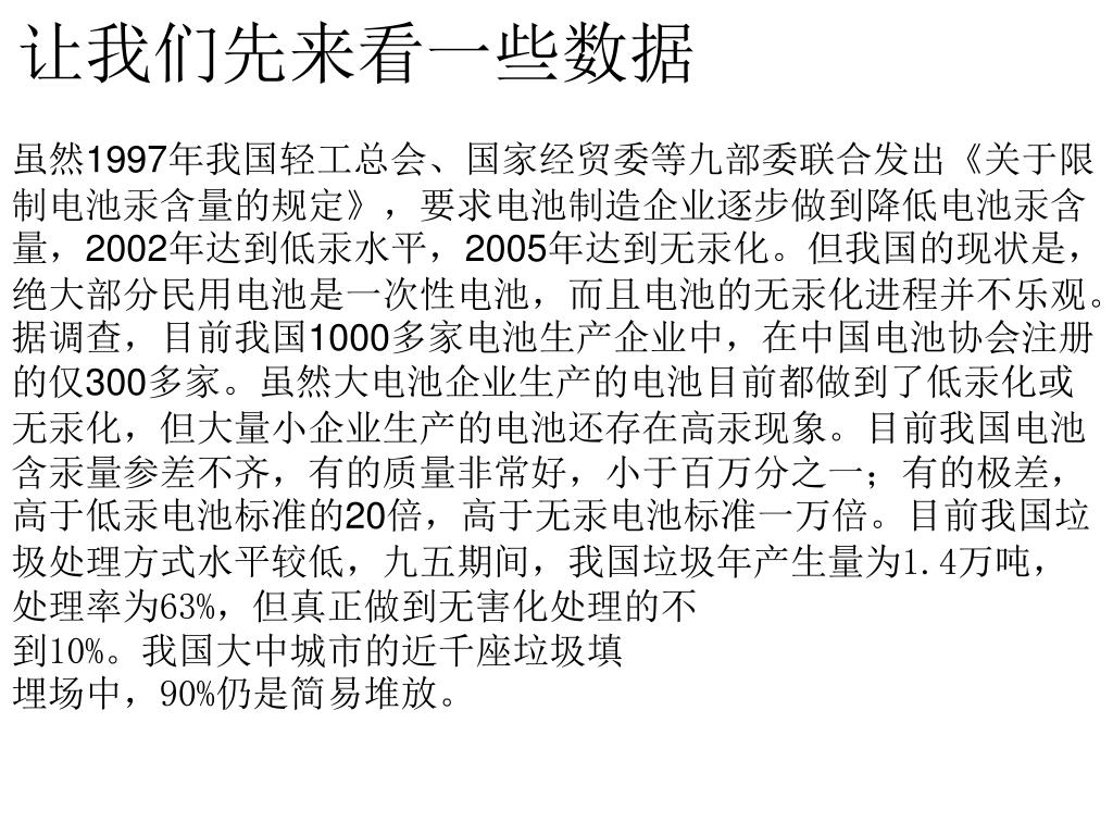 虽然1997年我国轻工总会、国家经贸委等九部委联合发出《关于限制电池汞含量的规定》,要求电池制造企业逐步做到降低电池汞含量,2002年达到低汞水平,2005年达到无汞化。但我国的现状是,绝大部分民用电池是一次性电池,而且电池的无汞化进程并不乐观。据调查,目前我国1000多家电池生产企业中,在中国电池协会注册的仅300多家。虽然大电池企业生产的电池目前都做到了低汞化或无汞化,但大量小企业生产的电池还存在高汞现象。目前我国电池含汞量参差不齐,有的质量非常好,小于百万分之一;有的极差,高于低汞电池标准的20倍,高于无汞电池标准一万倍。目前我国垃圾处理方式水平较低,九五期间,我国垃圾年产生量为1.4万吨,处理率为63%,但真正做到无害化处理的不虽然1997年我国轻工总会、国家经贸委等九部委联合发出《关于限制电池汞含量的规定》,要求电池制造企业逐步做到降低电池汞含量,2002年达到低汞水平,2005年达到无汞化。但我国的现状是,绝大部分民用电池是一次性电池,而且电池的无汞化进程并不乐观。据调查,目前我国1000多家电池生产企业中,在中国电池协会注册的仅300多家。虽然大电池企业生产的电池目前都做到了低汞化或无汞化,但大量小企业生产的电池还存在高汞现象。目前我国电池含汞量参差不齐,有的质量非常好,小于百万分之一;有的极差,高于低汞电池标准的20倍,高于无汞电池标准一万倍。目前我国垃圾处理方式水平较低,九五期间,我国垃圾年产生量为1.4万吨,处理率为63%,但真正做到无害化处理的不 到10%。我国大中城市的近千座垃圾填 埋场中,90%仍是简易堆放。 让我们先来看一些数据
