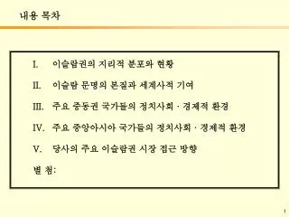 이슬람권의 지리적 분포와 현황 이슬람 문명의 본질과 세계사적 기여 주요 중동권 국가들의 정치사회 · 경제적 환경 주요 중앙아시아 국가들의 정치사회 · 경제적 환경 당사의 주요 이슬람권 시장 접근 방향 별 첨: 내용 목차