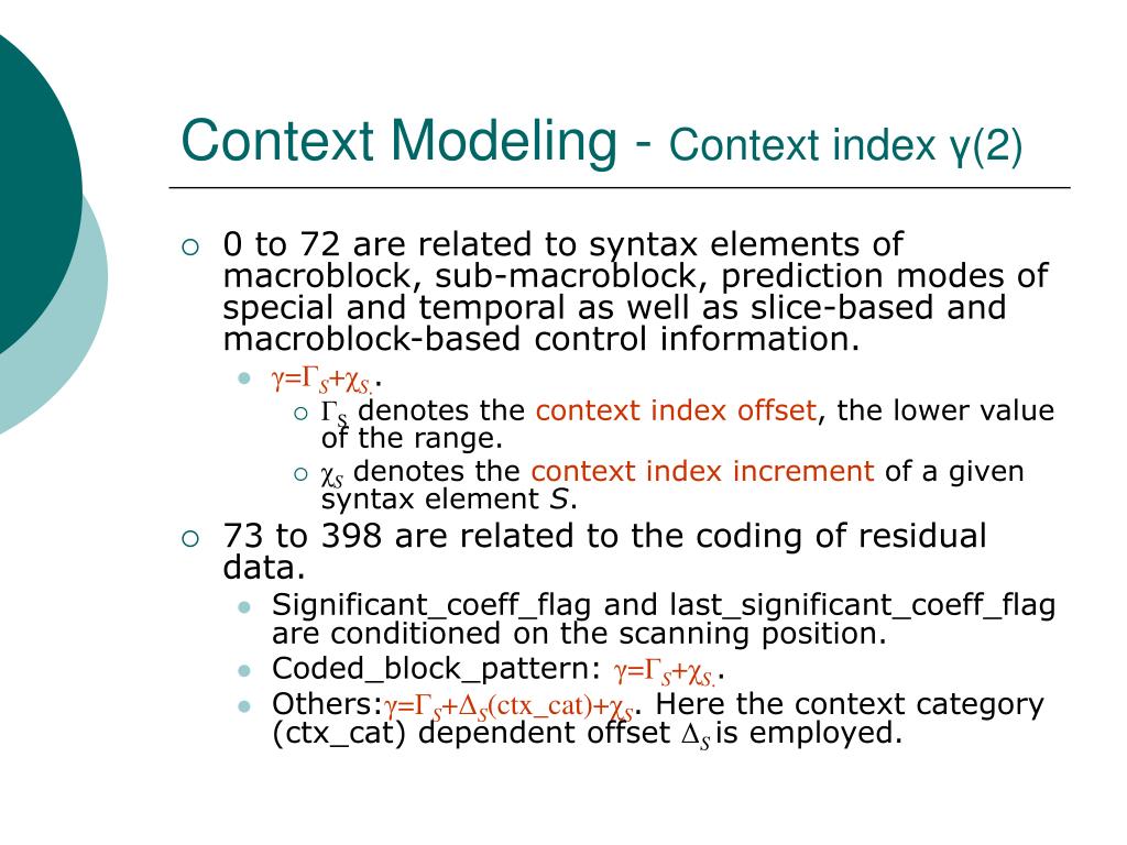 Context Modeling - Context index γ(1) • The entity of probability models can be arranged in a linear fashion such that each model can be identified by a so-called context index γ. • According to each context index γ, the probability model is determined by (αγ ,βγ) for 0≤ γ ≤398. • 6 bits for αγ and 1 bit for βγ. • αγis the probability state index and the (binary) βγrepresents the most probable symbol (MPS). 64 representative probability values