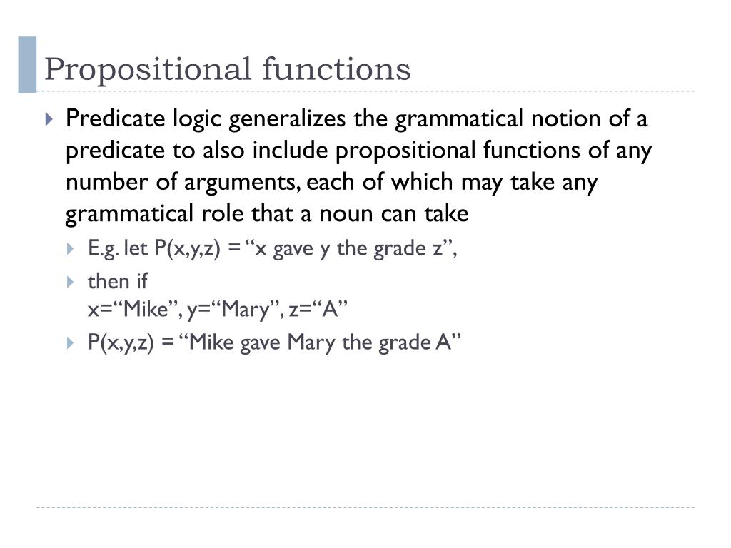 Topic #3 – Predicate Logic Propositional functions • Predicate logic generalizes the grammatical notion of a predicate to also include propositional functions of any number of arguments, each of which may take any grammatical role that a noun can take • E.g. let P(x,y,z) = “x gave y the grade z”, • then ifx=“Mike”, y=“Mary”, z=“A” • P(x,y,z) = “Mike gave Mary the grade A”