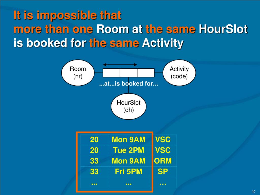 It is impossible that more than oneRoom atthe sameHourSlot is booked forthe sameActivity 10