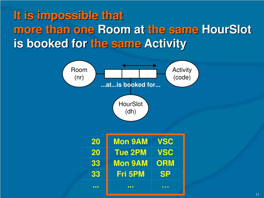 It is impossible that more than oneRoom atthe sameHourSlot is booked forthe sameActivity 11