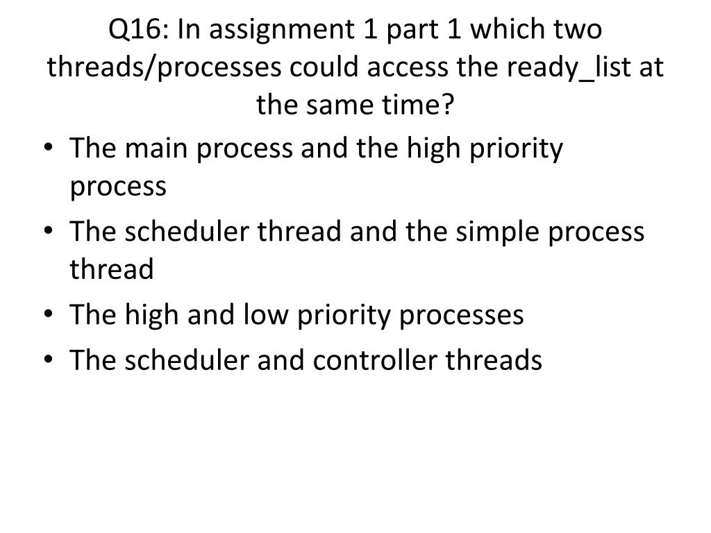 Q16: In assignment 1 part 1 which two threads/processes could access the ready_list at the same time? • The main process and the high priority process • The scheduler thread and the simple process thread • The high and low priority processes • The scheduler and controller threads