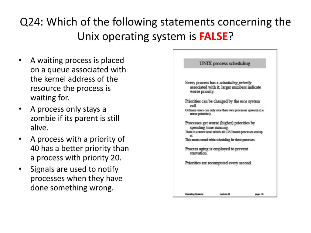 Q24: Which of the following statements concerning the Unix operating system is FALSE? • A waiting process is placed on a queue associated with the kernel address of the resource the process is waiting for. • A process only stays a zombie if its parent is still alive. • A process with a priority of 40 has a better priority than a process with priority 20. • Signals are used to notify processes when they have done something wrong.