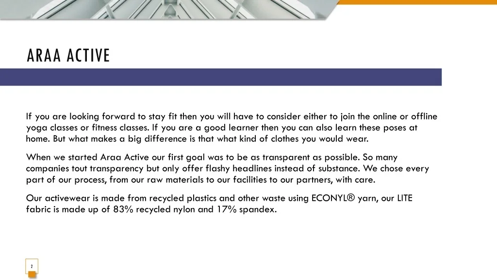 Araa active If you are looking forward to stay fit then you will have to consider either to join the online or offline yoga classes or fitness classes. If you are a good learner then you can also learn these poses at home. But what makes a big difference is that what kind of clothes you would wear. When we started Araa Active our first goal was to be as transparent as possible. So many companies tout transparency but only offer flashy headlines instead of substance. We chose every part of our process, from our raw materials to our facilities to our partners, with care. Our activewear is made from recycled plastics and other waste using ECONYL® yarn, our LITE fabric is made up of 83% recycled nylon and 17% spandex.
