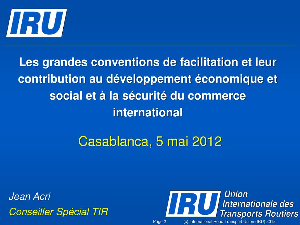 Les grandes conventions de facilitation et leur contribution au développement économique et social et à la sécurité du commerce international Casablanca, 5 mai 2012 Jean Acri Conseiller Spécial TIR (c) International Road Transport Union (IRU) 2012