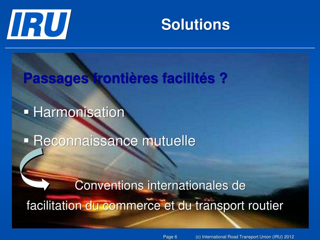 Solutions Passages frontières facilités ? • Harmonisation • Reconnaissance mutuelle Conventions internationales de facilitation du commerce et du transport routier (c) International Road Transport Union (IRU) 2012