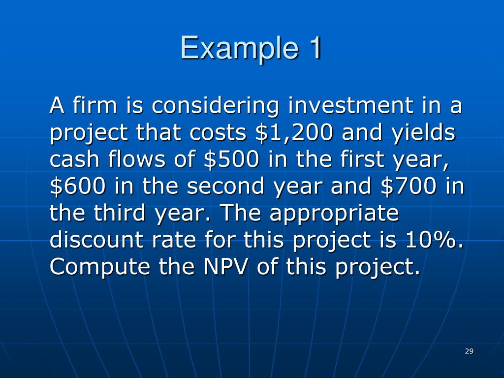 Example 1 A firm is considering investment in a project that costs $1,200 and yields cash flows of $500 in the first year, $600 in the second year and $700 in the third year. The appropriate discount rate for this project is 10%. Compute the NPV of this project.