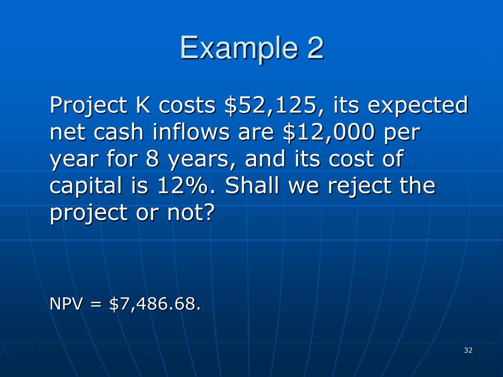 Example 2 Project K costs $52,125, its expected net cash inflows are $12,000 per year for 8 years, and its cost of capital is 12%. Shall we reject the project or not? NPV = $7,486.68.