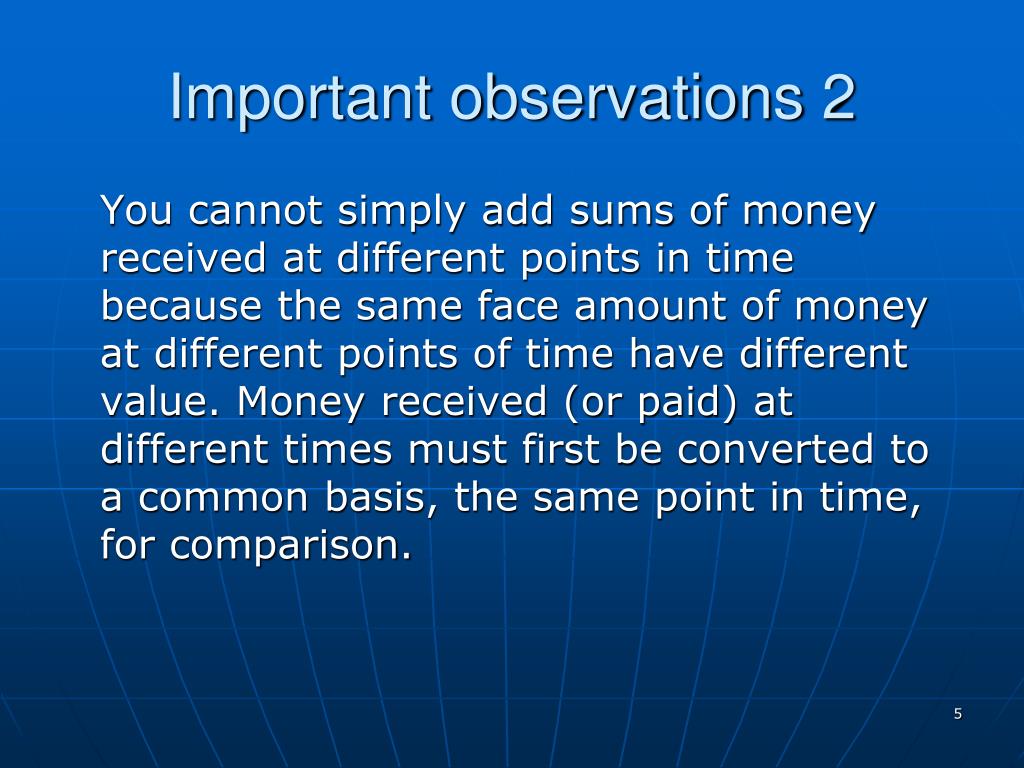 Important observations 2 You cannot simply add sums of money received at different points in time because the same face amount of money at different points of time have different value. Money received (or paid) at different times must first be converted to a common basis, the same point in time, for comparison.
