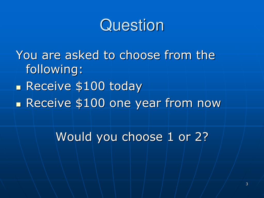 Question You are asked to choose from the following: • Receive $100 today • Receive $100 one year from now Would you choose 1 or 2?