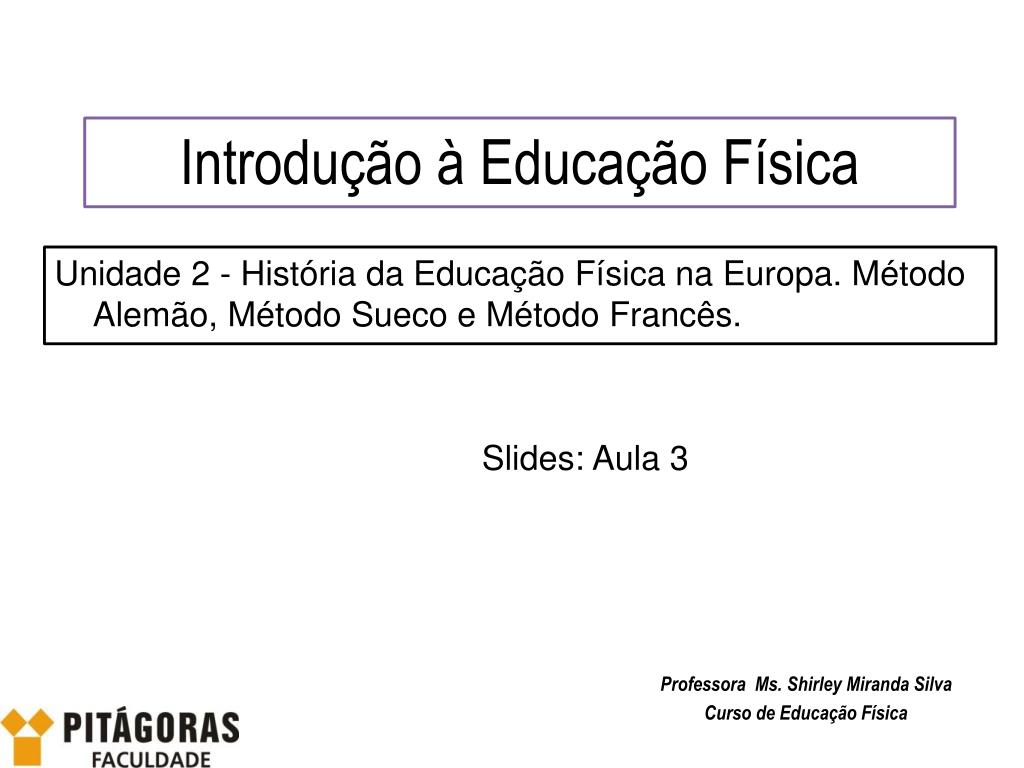 Introdução à Educação Física Unidade 2- História da Educação Física na Europa. Método Alemão, Método Sueco e Método Francês. Slides: Aula 3 • Professora Ms. Shirley Miranda Silva • Curso de Educação Física